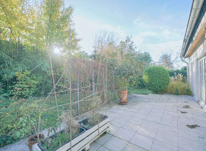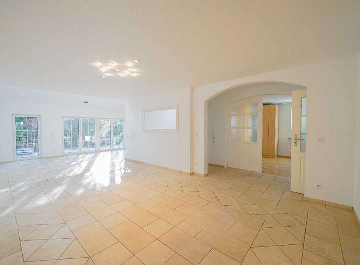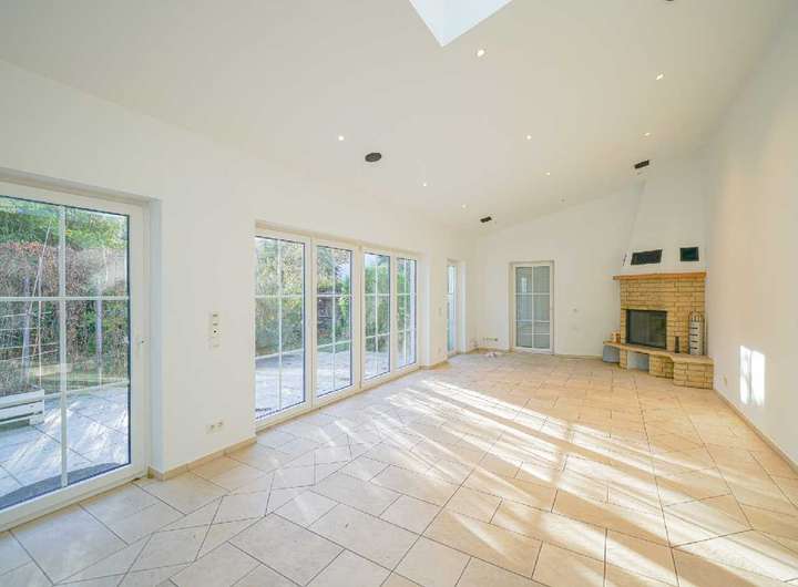 Über die großen, bodentiefen Fenster gelangen Sie auf die Terrasse mit Blick in den schönen Garten.