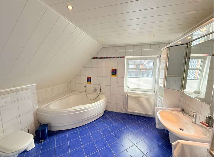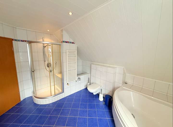 - großes Badezimmer mit Eckbadewanne und Dusche