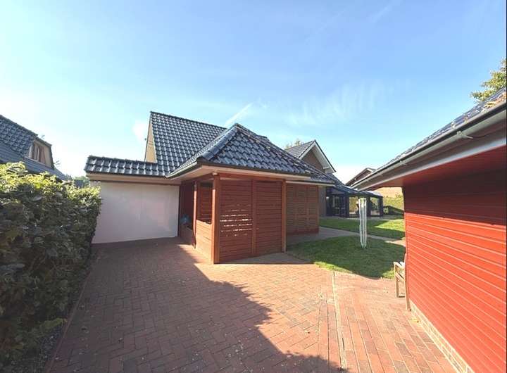 - Carport mit großer Schiebetür zum Garten und Holzlager