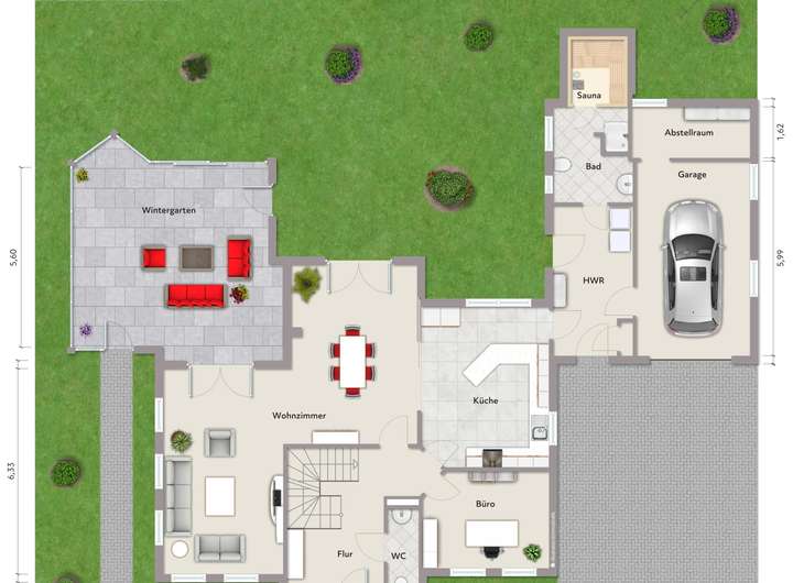 Flur, Gäste-WC, Büro, großes Wohn- und Esszimmer, Wintergarten, Küche, HWR, Bad, Sauna