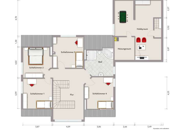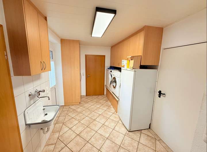Darüber hinaus wurde der Bereich über der Garage ausgebaut. Dort befinden sich der Heizungsraum und ein großzügiger Hobbyraum. Ideal für die Freizeitgestaltung.