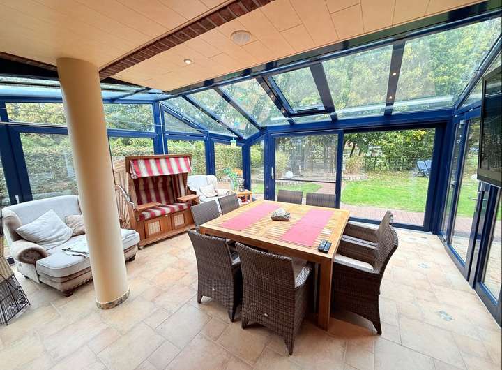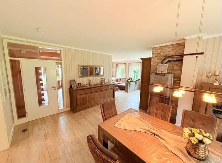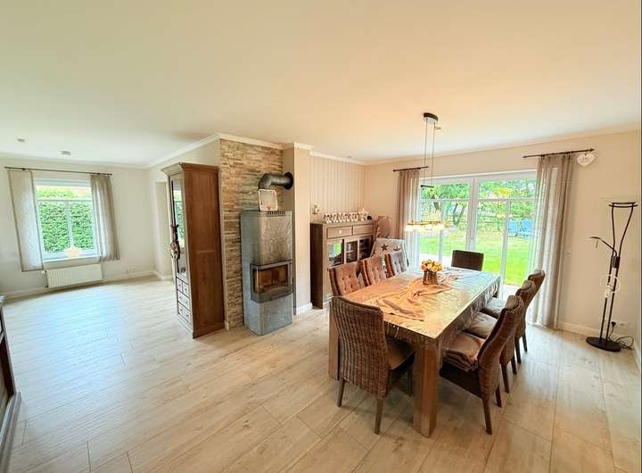 Der besonders geräumige Wohn-/Essbereich mit Ofen und direktem Zugang zum ca. 34 m² großen Wintergarten bildet das Herzstück dieser Traumimmobilie.