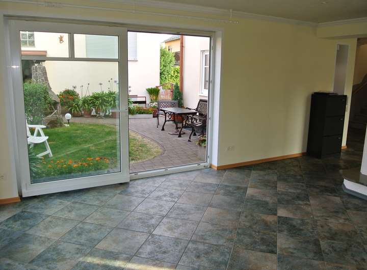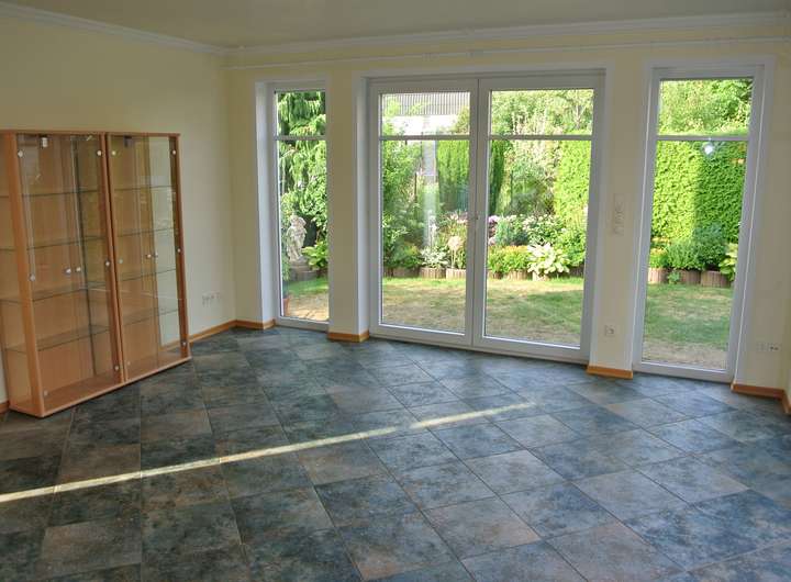 - bodentiefe Fenster mit zwei Zugängen zum Garten und zu der Terrasse
