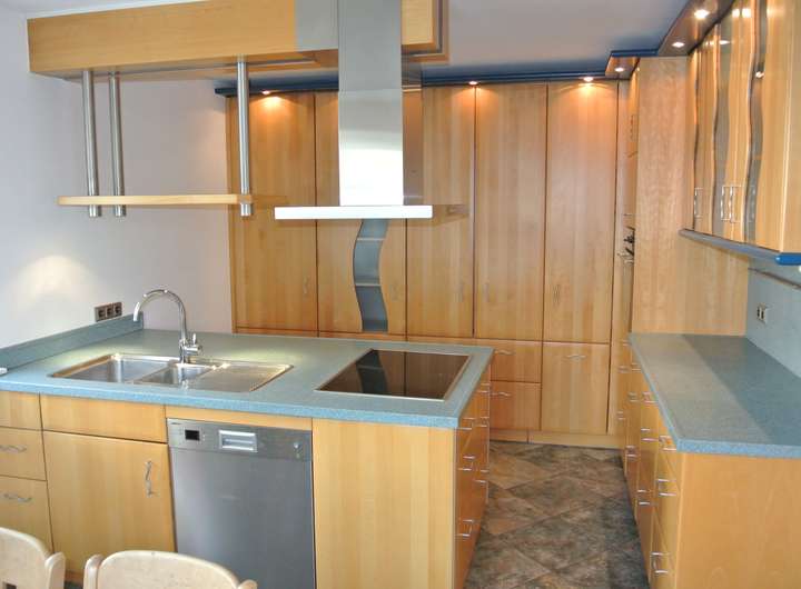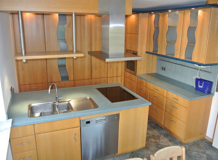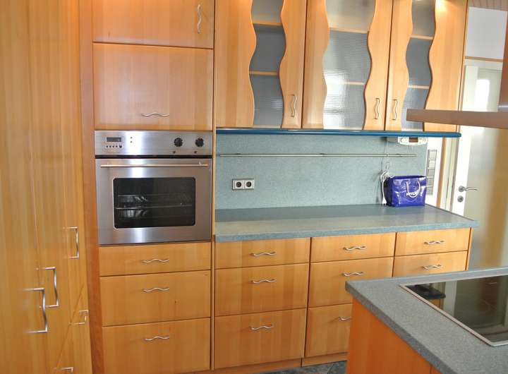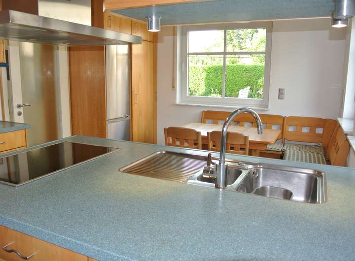 - großzügige Küche mit Einbauküche und allen erforderlichen Elektrogeräten und einem Esstisch mit Sitzgruppe