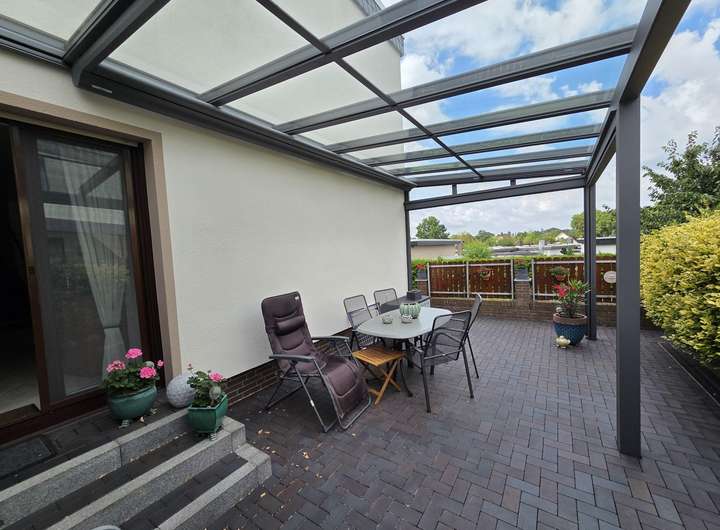 Die 30 m² große Terrasse wurde 2021 überdacht mit elektrischer Markise und 2 elektrischen Windfängen. Die Terrasse, Wege ums Haus und die Auffahrt wurden im Jahr 2011 neu gepflastert und im Frühjahr 2025 gereinigt und imprägniert; die Außenanlagen sind pflegeleicht angelegt.