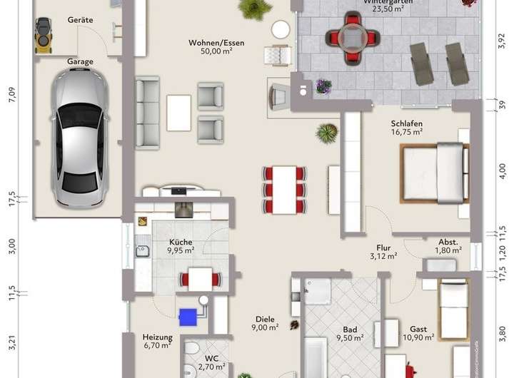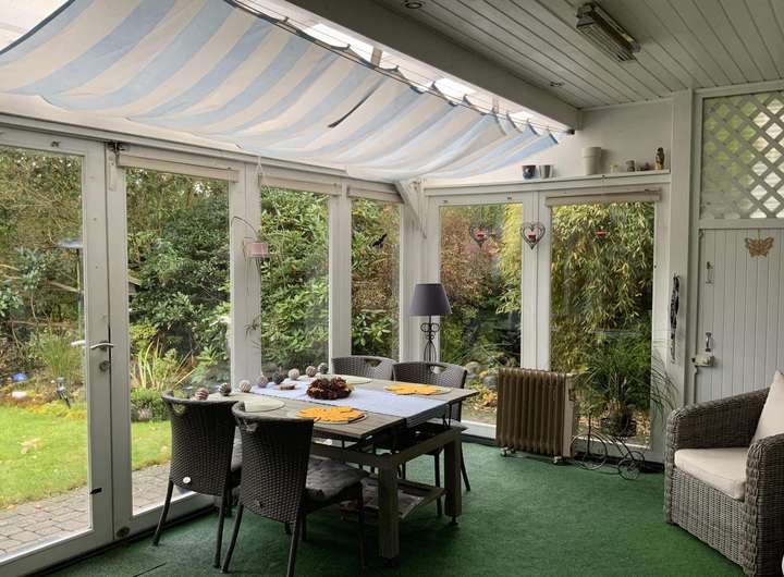 Freuen Sie sich auf ein schönes Zuhause für die ganze Familie! Über den geräumigen Flur betreten Sie das große, helle Wohnzimmer mit Essbereich, Zugang in den Garten und angrenzendem Wintergarten. Das Schlafzimmer ist mit einem Einbaukleiderschrank ausgestattet und bietet Ihnen ebenfalls einen Zugang zum Wintergarten. Ein weiteres Zimmer nutzen Sie als Kinder-, Gäste- oder Arbeitszimmer. Die Küche ist mit einer Einbauküche und einem Esstisch möbliert. Von hier kommen Sie in den praktischen Hauswirtschaftsraum, der Ihnen durch eine Nebeneingangstür Zugang nach draußen gewährt. So haben Sie kurze Wege zum Auto und zur Garage. Das Tageslichtbad ist mit einer Dusche und einer Eckbadewanne ausgestattet. Ein Gäste-WC ergänzt den durchdachten Grundriss optimal. Die genaue Aufteilung der einzelnen Räume entnehmen Sie bitte der beigefügten Grundrisszeichnung.