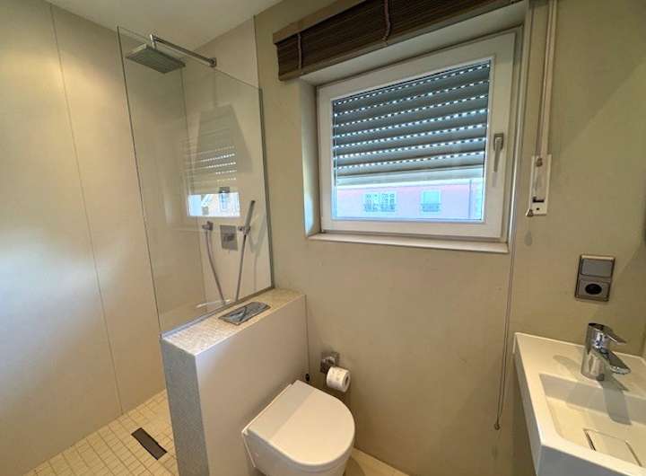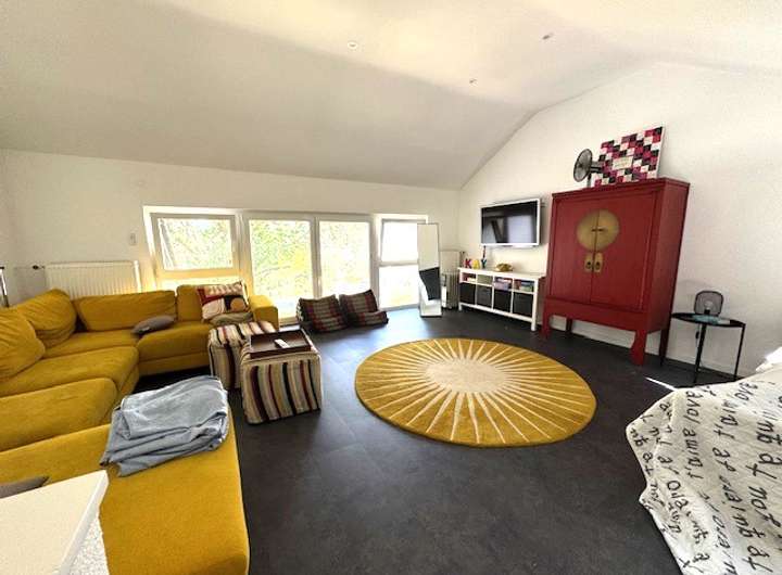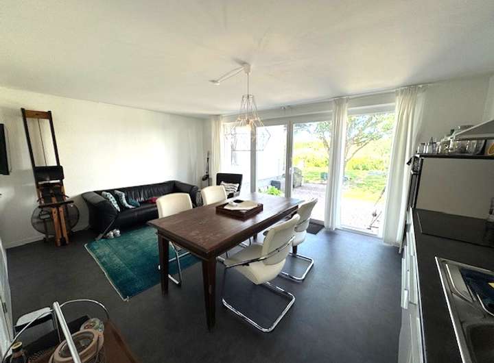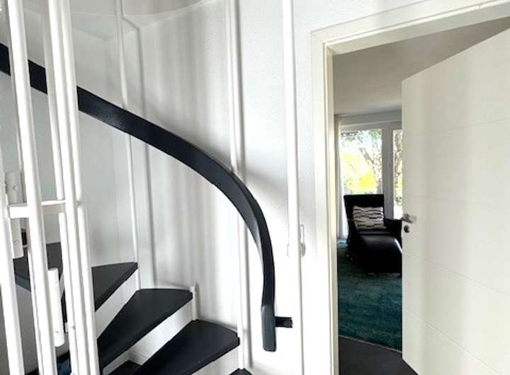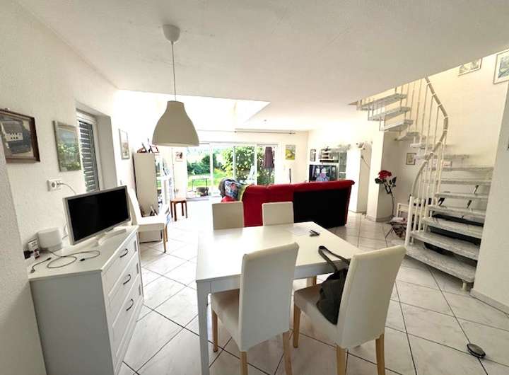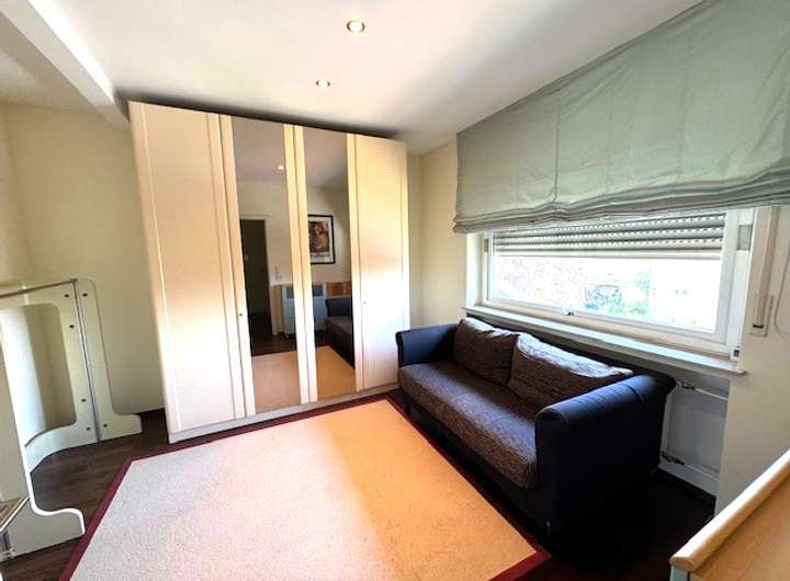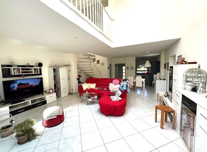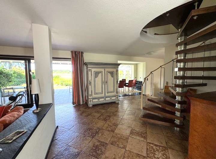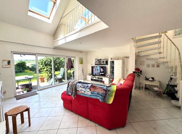 Diele, Gäste WC, offene Einbauküche, großes Wohnzimmer mit hohen Decken und offener Galerie, Zugang zur Terrasse und Garten. Obergeschoss: Schlafzimmer, Tageslichtbad, offenes Galeriezimmer mit Blick ins unten gelegene Wohnzimmer. Der Gesamtzustand ist sehr gut inklusive Fussbodenheizung (das Nebengebäude 1 ist derzeit noch vermietet).