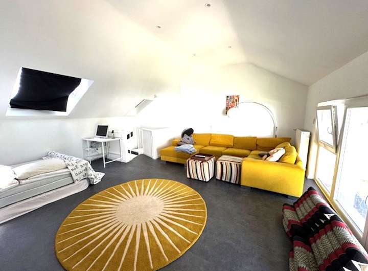 Aufteilung Nebengebäude 2 (rechts) Erdgeschoss, Baujahr 1987: Diele, neues Tageslichtbad, Wohnzimmer mit offener Küche, Zugang zur Terrasse und Garten, Abstellkammer. Obergeschoss: Großes Schlafstudio mit bodentiefen Fenstern.