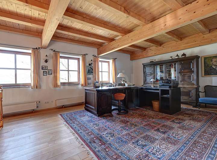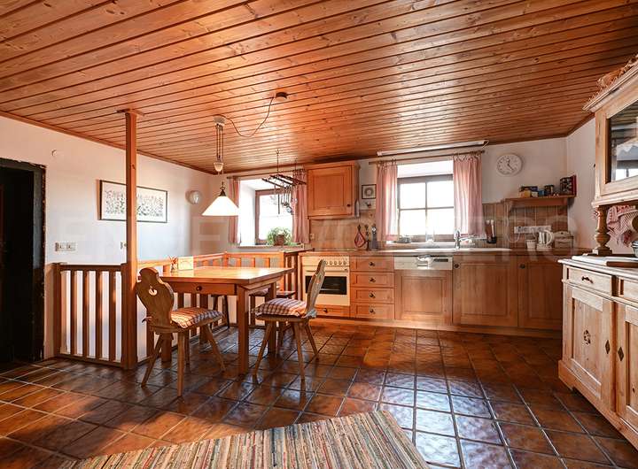 - Die Tenne wurde in den 90er-Jahren zum Wohnraum mit Galerie umgebaut und mit einem traditionellen Kachelofen ausgestattet