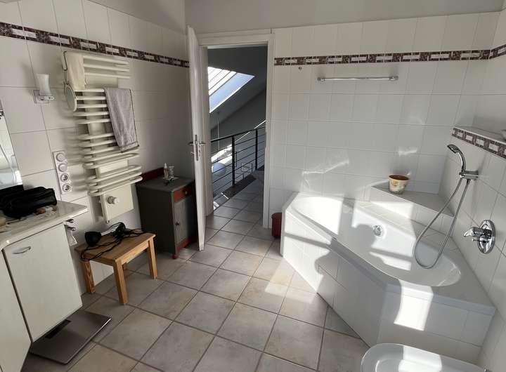 Über die offene Galerie, die einen wunderbaren Blick in den Wohnbereich ermöglicht, erreichen Sie die weiteren Räume. Ein großes Dachfenster durchflutet das Haus mit Tageslicht. Hier erwarten Sie ein komfortables Schlafzimmer mit Einbauschränken, ein Badezimmer mit Badewanne und Tageslicht, ein weiteres Bad mit Dusche sowie ein zusätzlicher kleinerer Raum, der sich vielseitig nutzen lässt.