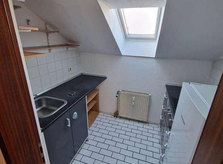 Kleine Küche mit neuwertigen Elektrogeräten.