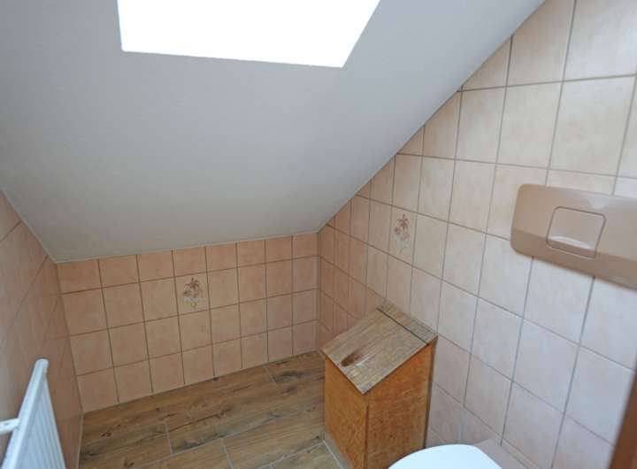 Im Erdgeschoss erwartet Sie ein großzügiger Wohn- und Essbereich, der durch den gemütlichen Kachelofen eine besondere Wohlfühlatmosphäre schafft. Von hier aus haben Sie direkten Zugang zur Terrasse und in den liebevoll angelegten Garten. Die Einbauküche ist im Mietumfang enthalten und bietet alle notwendigen Geräte sowie ausreichend Stauraum. Ein Gäste-WC komplettiert das Erdgeschoss.