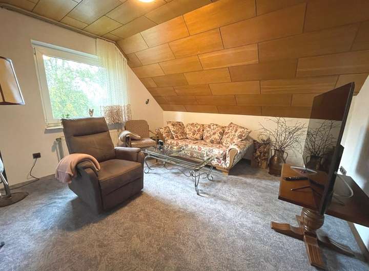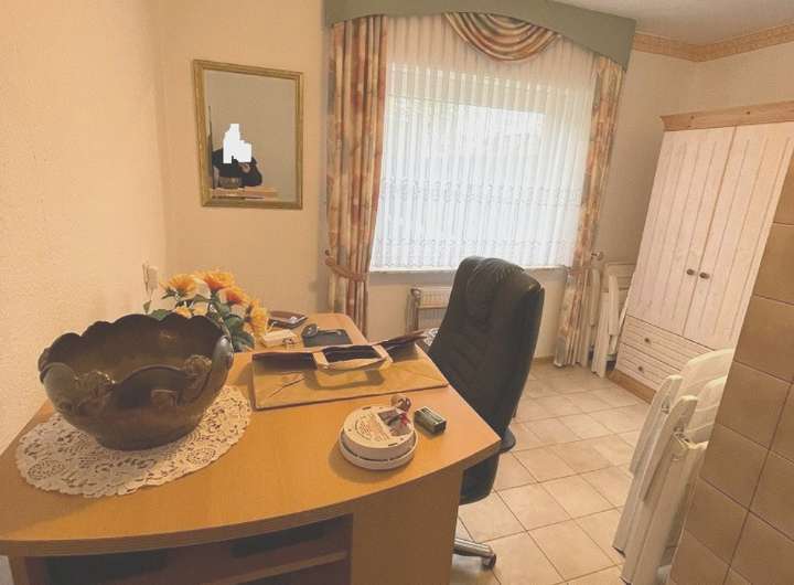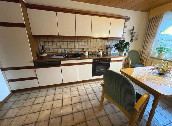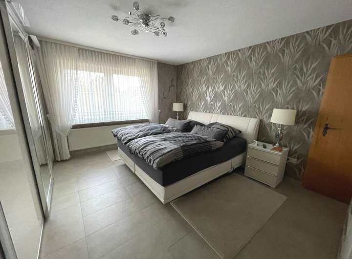 Das Erdgeschoss überzeugt ebenfalls durch seine Großzügigkeit. Über den Windfang gelangt man in eine große Diele, die alternativ als Essdiele genutzt werden kann. Der Wohnbereich ersteckt sich über ca. 50 m² und ist von der Diele aus begehbar, wodurch ein offener und einladender Raumfluss entsteht. Besonders hervorzuheben ist der leicht abgesenkte Sitzber3eich, der eine behagliche Atmosphäre schafft. Ergänzt durch wird das gemütliche Ambiente durch den Kamin, der an kühlen Tagen wohlige Wärme und ein stilvolles Zentrum für gesellige Stunden bietet. Die Küche und das Wohnzimmer bieten direkten Zugang zu einer weitläufigen Terrasse mit Markise. Ein Abstellraum, derzeit als Büro genutzt, ein Schlafzimmer mit angrenzendem Elternbad (Dusche/WC) sowie ein Gäste-WC runden die funktionale Aufteilung ab.