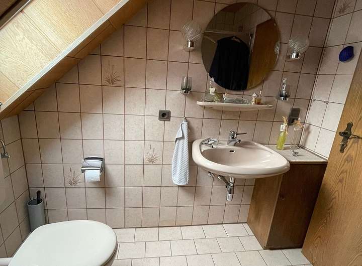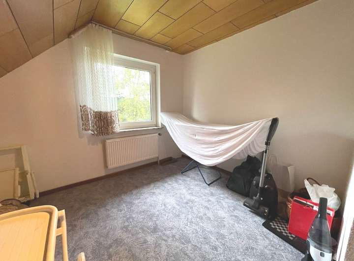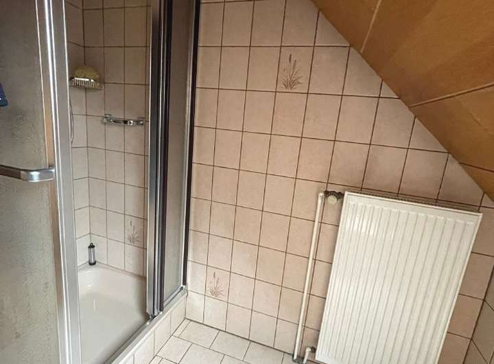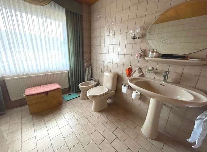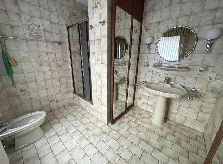 Im Obergeschoss gelangen Sie über einen Windfang in ein beeindruckendes, fast galerieartiges Treppenhaus, das die Großräumigkeit des Hauses sofort spürbar macht. Hier befinden sich das Hauptschlafzimmer, zwei weitere Schlafzimmer, ein Wohnzimmer mit Zugang zur Loggia, die mit einer Markise ausgestattet ist, eine Küche sowie zwei Badezimmer – eines mit Wanne und WC, das andere mit Dusche und WC. Ergänzt wird die Etage durch einen Hauswirtschaftsraum und eine großzügige Diele.