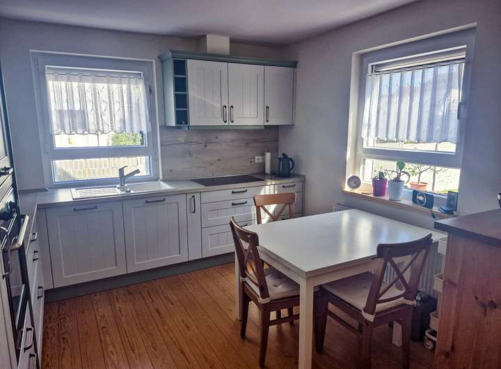 Vom Wohnzimmer aus gelangen Sie in die angrenzende Küche, die funktional und modern ausgestattet ist. Hier finden Sie genügend Raum für einen Esstisch, an dem die Familie gemeinsam die Mahlzeiten genießen kann. Die Küche ist der ideale Ort, um kulinarische Köstlichkeiten zuzubereiten und bietet einen schönen Ausblick in den Garten.