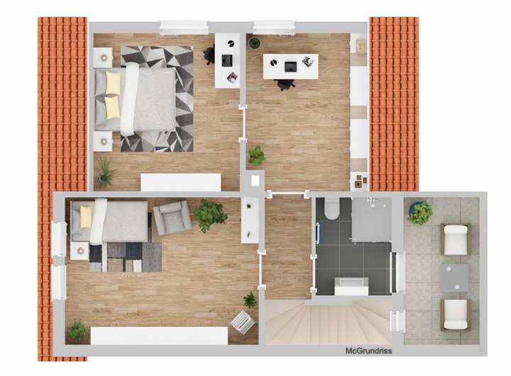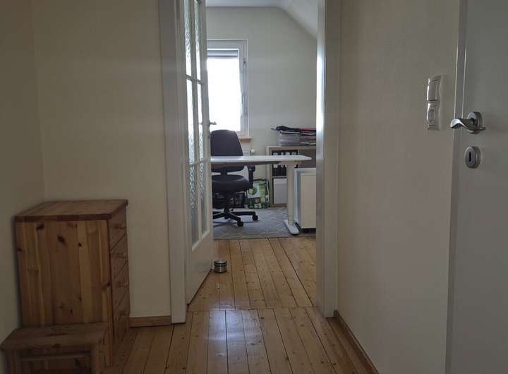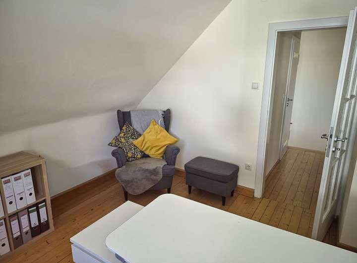 Im Obergeschoss befinden sich drei weitere Zimmer, die individuell als Schlafzimmer, Kinderzimmer oder Büro genutzt werden können. Jedes Zimmer ist gut geschnitten und bietet ausreichend Platz für die persönliche Entfaltung. Das Badezimmer auf dieser Etage ist mit einer Dusche ausgestattet und bietet einen direkten Zugang zum Balkon..