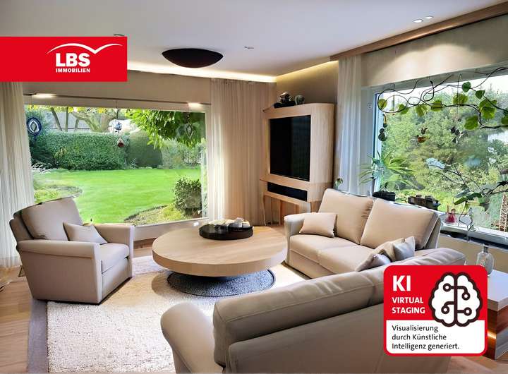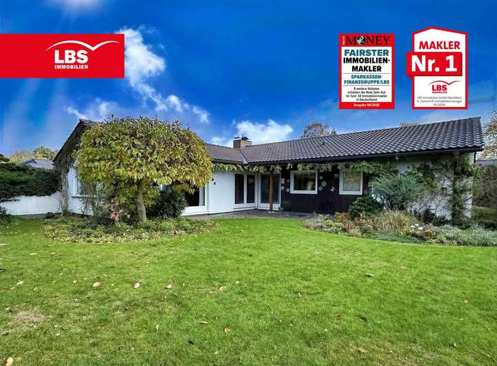 Wir freuen uns, Ihnen den im Jahr 1968 erstellten freistehenden Bungalow mit einer Grundstücksgröße von rund 1.003 m² und ca. 173 m² Wohnfläche vorstellen zu dürfen. Diese Immobilie wurde in Fertigbauweise vom Hersteller Nachbarschulte Holzbauwerke & Co. KG errichtet und besitzt einen massiv erstellten Keller. Rundum um die Immobilie ist ein parkähnlicher, uneinsehbarer Garten angelegt. Zur Bewässerung des Gartens steht ein Brunnen zur Verfügung.