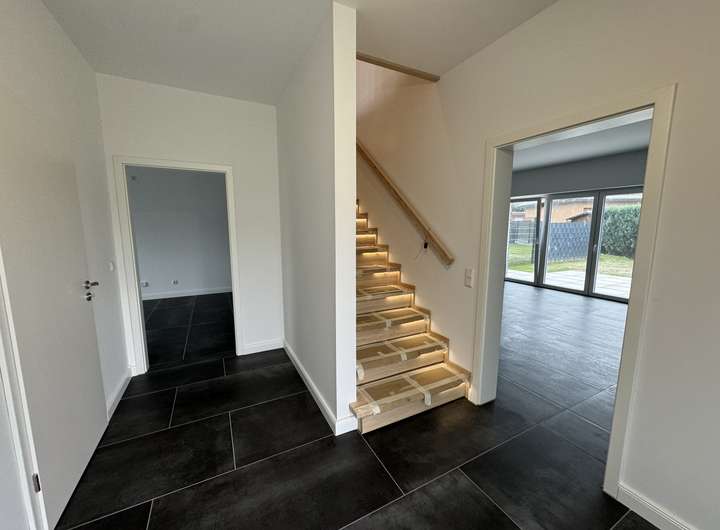 Der großzügige, lichtdurchflutete Wohn- und Essbereich bildet das Herzstück des Hauses. Große Fensterflächen sorgen für eine angenehme Helligkeit und eröffnen den Blick in den Garten. Im gesamten Erdgeschoss wurden großformatige Architektenfliesen verlegt, die dem Haus eine elegante und moderne Note verleihen.