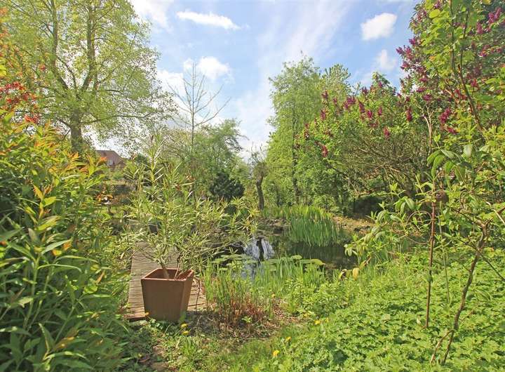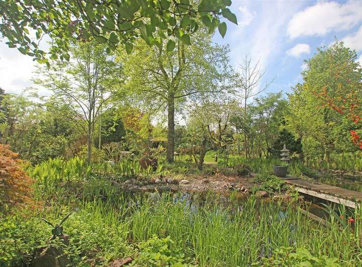 Der liebevoll angelegte Ziergarten lädt zum Entspannen ein und bietet einen geschützten Rückzugsort mit einer hübschen Vogelschutzhecke. Bronze- und Granitskulpturen, Keramiken sowie Gartenmöbel können nach Absprache übernommen werden.