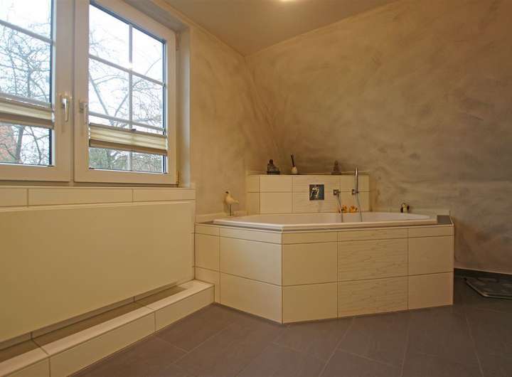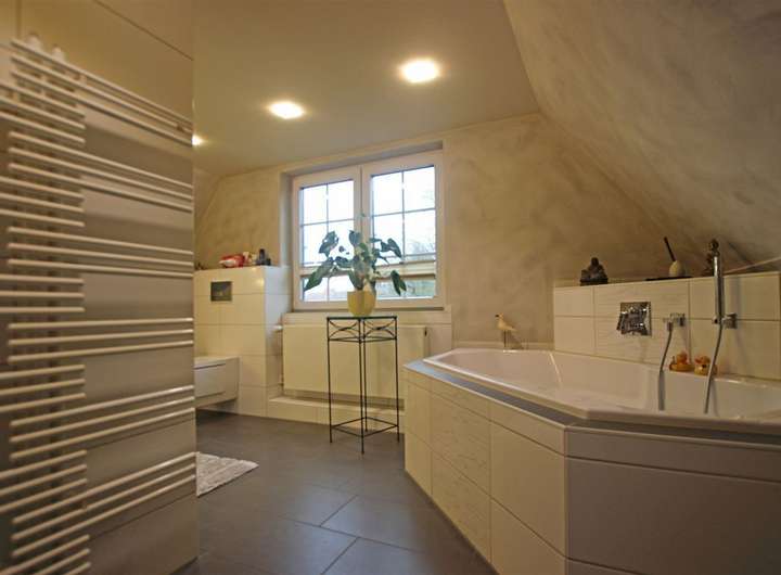 - Modernisiertes Vollbad (2014) mit Fenster, Eckbadewanne, nahezu bodengleicher Dusche und Dusch-WC