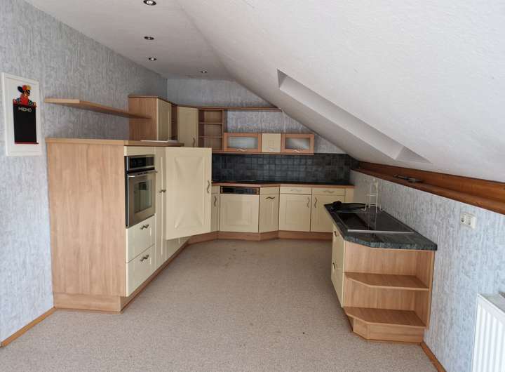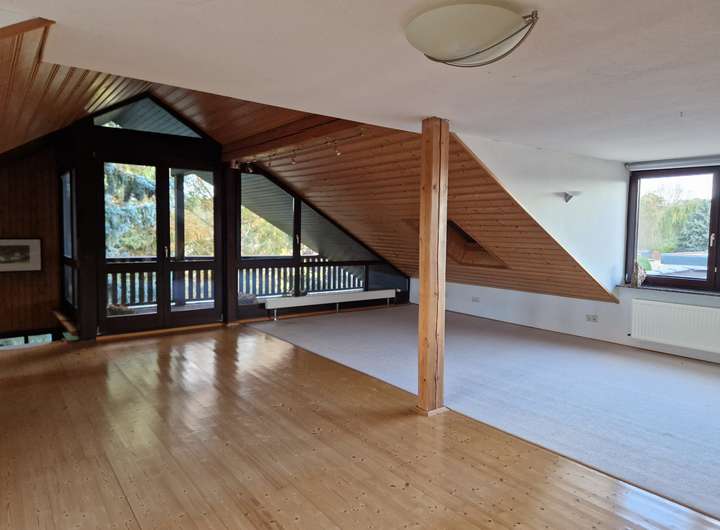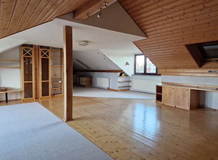 Durch das speparat angebaute Treppenhaus gelangt man in das Dachgeschoss, welches zu einer riesigen Loftwohnung ausgebaut ist, incl. Küche und einem Bad mit Wanne und Dusche. Hier wäre auch eine Nutzung als Büro oder ähnliches denkbar.