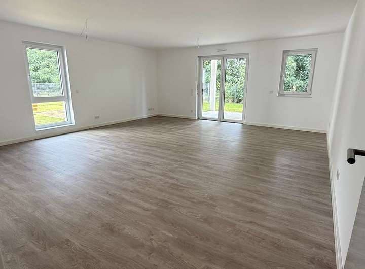 - ein lichtdurchflutetes Wohnzimmer mit offener Küche und direktem Zugang zur überdachten Terrasse und dem privaten Garten,