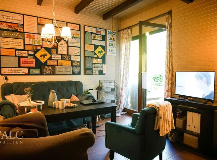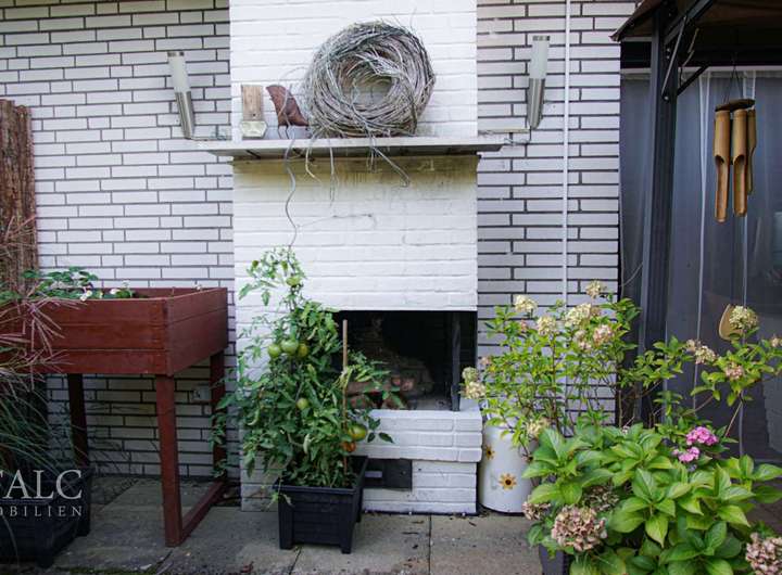 Beim Betreten dieses charmanten Hauses mit einer Wohnfläche von ca. 160 m² werden Sie von einem einladenden Eingangsbereich empfangen. Direkt zur Rechten befindet sich das Gäste-WC, praktisch für Besucher. Der Flur führt Sie weiter in das großzügige Wohnzimmer, das mit seinen großen Fenstern viel Tageslicht bietet und einen direkten Zugang zur Terrasse mit Außenkamin hat. Hier können Sie entspannte Stunden mit Blick auf den gepflegten Garten genießen.