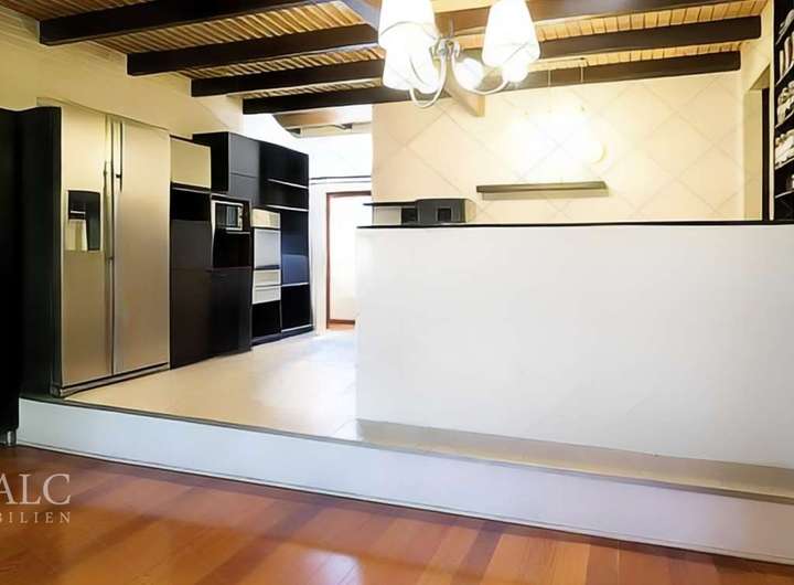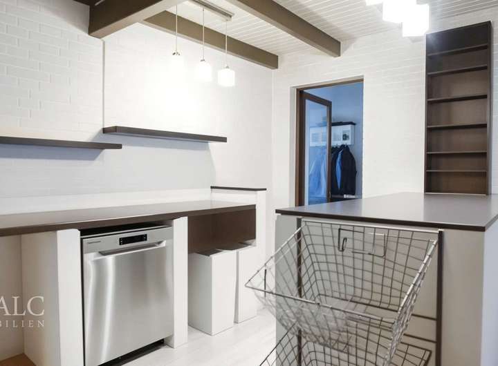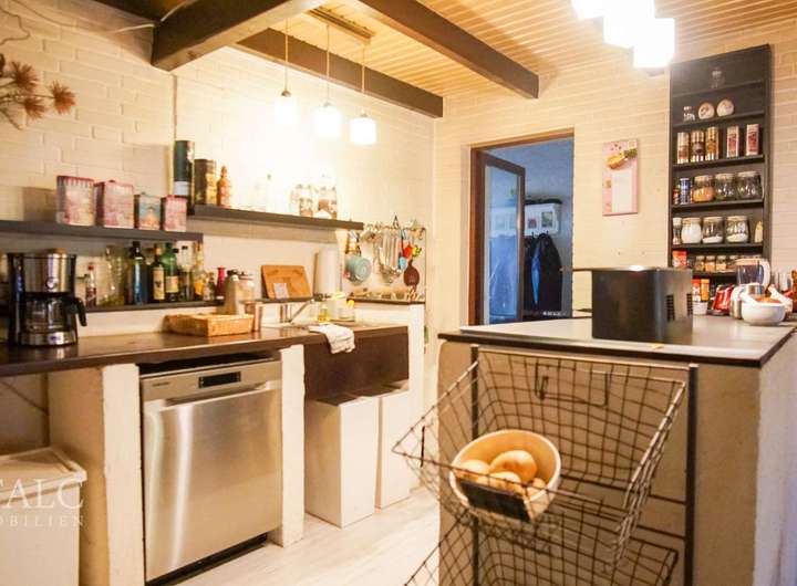 Die Küche, aufgeteilt in zwei Ebenen, ist sowohl funktional als auch stilvoll gestaltet. Der obere Bereich bietet ausreichend Platz für kulinarische Experimente, während der Sitzbereich im unteren Teil ideal für gemütliche Mahlzeiten ist.