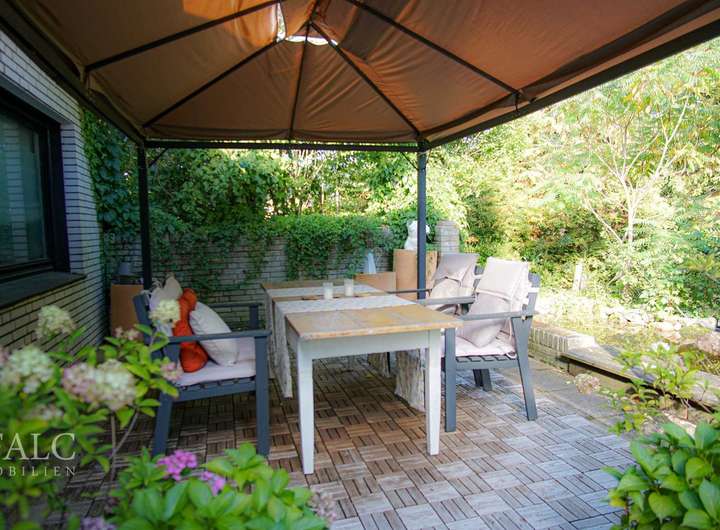 Der Außenbereich des Hauses ist ein wahres Highlight. Die Terrasse lädt zu geselligen Abenden ein, während der Garten mit seinen verschiedenen Pflanzen und dem Außenkamin ein Gefühl von Ruhe und Entspannung vermittelt. Die beiden Teiche im Garten bilden eine harmonischen Ausgleich zu den Grünflächen.