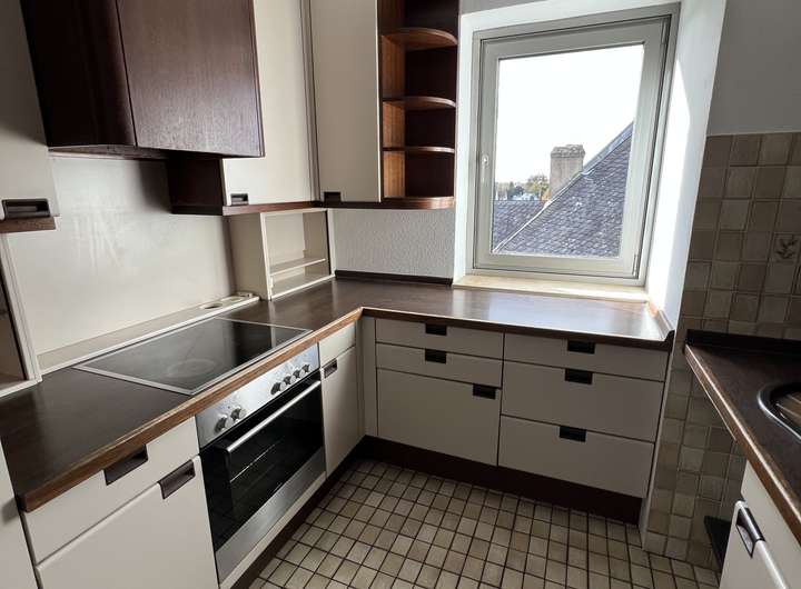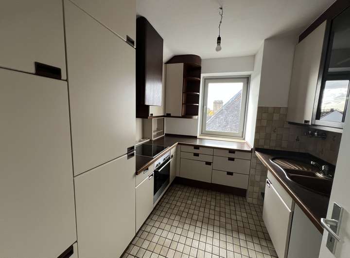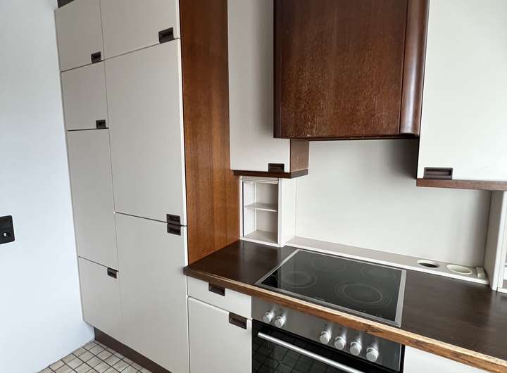Beim Betreten der Wohnung gelangen Sie in den großzügigen, offenen Wohnbereich mit dekorativen Holzbalken an der Decke und Zugang zur sonnigen Süd-Terrasse. Die Decke ist bis in die Dachspitze geöffnet und sorgt für ein beeindruckendes Raumgefühl. Angrenzend befindet sich die Küche, die mit einer älteren, aber hochwertigen Poggenpohl-Einbauküche ausgestattet ist. Das innenliegende Duschbad im eleganten Colani-Stil überzeugt mit einem Hänge-WC, einem extravaganten Säulenwaschtisch und einer Dusche mit außergewöhnlicher Sitzbank.