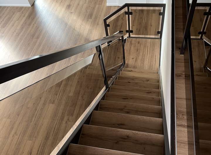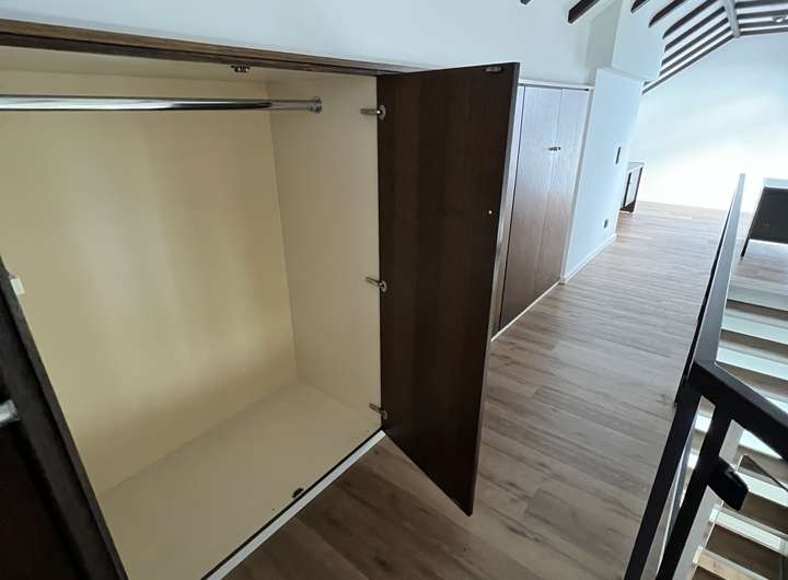 Eine stilvolle Treppe mit Rauchglasgeländer führt in die Galerieebene. Hier befindet sich ein offener Arbeitsbereich, entlang der Empore sind praktische Einbauschränke in der Dachschräge integriert. Von der Empore aus gelangen Sie in das Schlafzimmer, das ebenfalls über Einbauschränke in den Schrägen verfügt. Teilweise sind die Dachschrägen mit integrierter Deckenbeleuchtung ausgestattet und schaffen so ein harmonisches Lichtambiente.