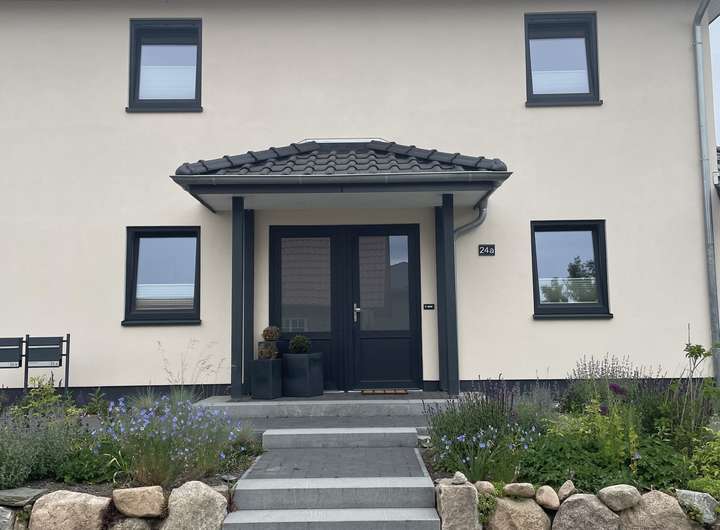 Kaminofen im Wohnzimmer, solarbetriebene Außenjalousien im Untergeschoss, Carport mit E-Ladestation, 2 voll ausgestattete Bäder, Fußbodenheizung, Solaranlage zur Warmwasseraufbereitung, Terrasse, Balkon im Obergeschoss.