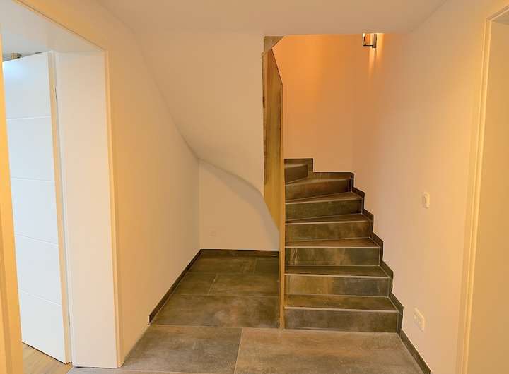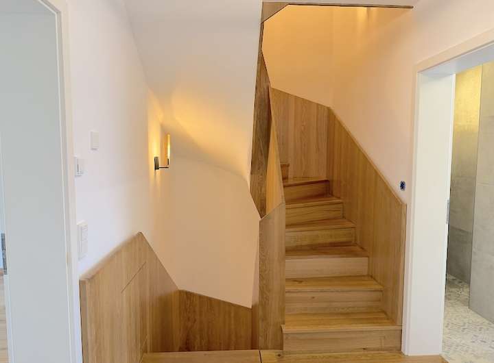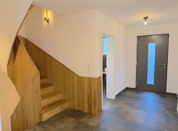 Der großzügige Eingangsbereich öffnet sich zum lichtdurchfluteten Wohnraum und schafft eine einladende Atmosphäre. Die massive Eichenholztreppe verbindet alle Etagen harmonisch und setzt zugleich einen markanten gestalterischen Akzent.