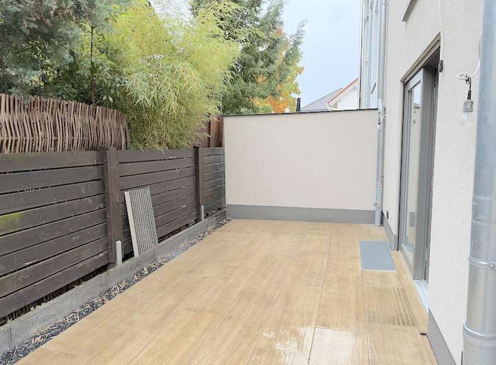 Der lichtdurchflutete Wohnbereich mit maßgefertigtem Einbauschrank und Zugang zur sonnigen Terrasse – ein Ort zum Entspannen und Wohlfühlen. Die moderne Einbauküche überzeugt mit hochwertiger Ausstattung. Darüber hinaus befindet sich auf dieser Ebene ein helles Tageslichtduschbad mit ebenerdiger Dusche.