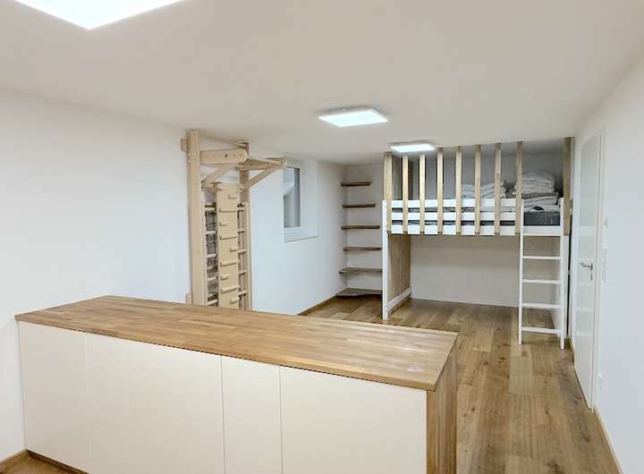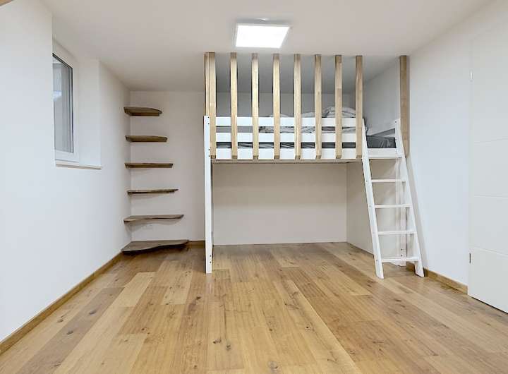 Der Souterain bietet vielseitige Nutzungsmöglichkeiten und überzeugt mit einer durchdachten Raumaufteilung. Neben großzügigen Abstellflächen und einer praktischen Waschküche befindet sich hier ein wohnlich ausgebauter Bereich mit Einbaumöbeln, der sich ideal als Hobby-, Fitness- oder Arbeitsraum nutzen lässt.