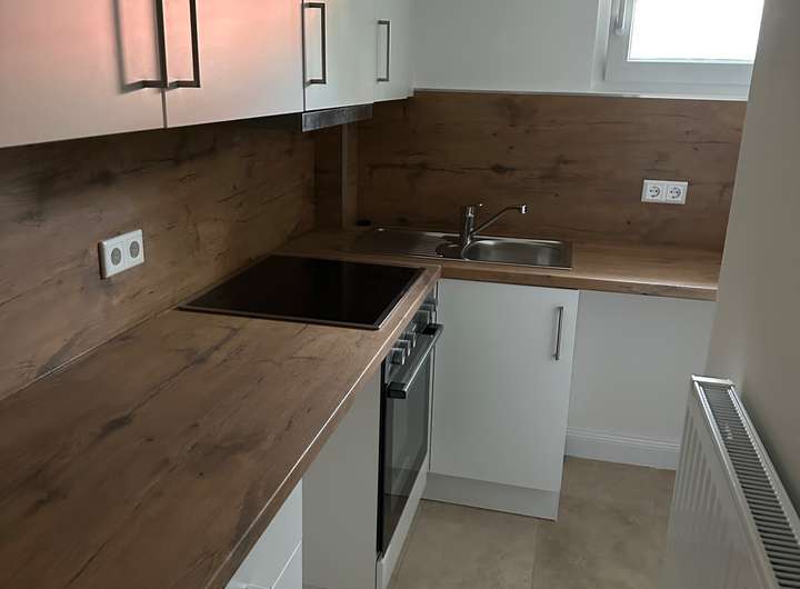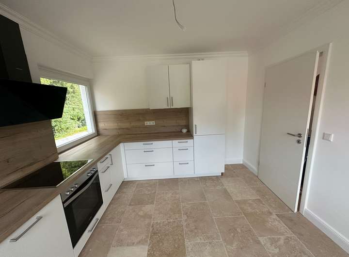 Küche: Eine Einbauküche Bj.: 2025 mit weißen Ober- und Unterschränken sowie Edelstahlgriffen ist vorhanden. Backofen mit Cerankochfeld. Geschirrspüler. Abzugshaube. Elektrogeräte von Constructa. Edelstahlspüle mit ein Hebelmischer. Kunststoffbeschichtete Arbeitsplatte in Holzoptik.
