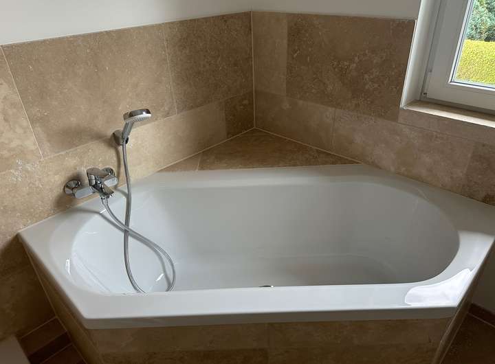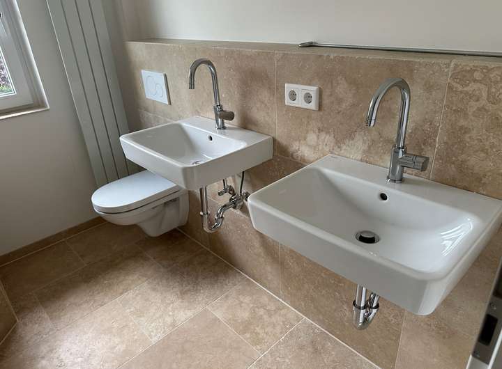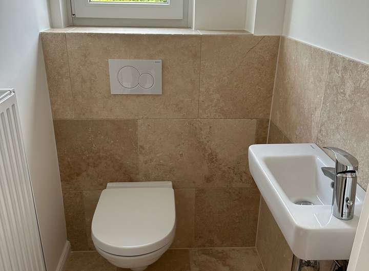 Bäder und WC : Bäder und WC-Anlagen mit weißen Objekte. Boden- und Wandfliesen im hochwertigen Travertin.