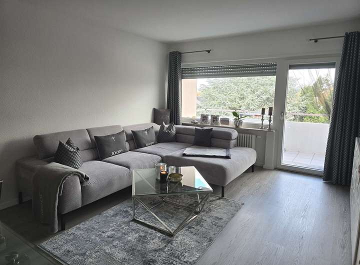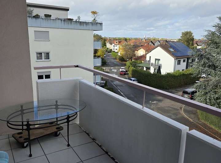 Vom Wohnzimmer erreicht man den gut geschnittenen Balkon. Die Überdachung bietet Witterungsschutz und spendet Schatten.