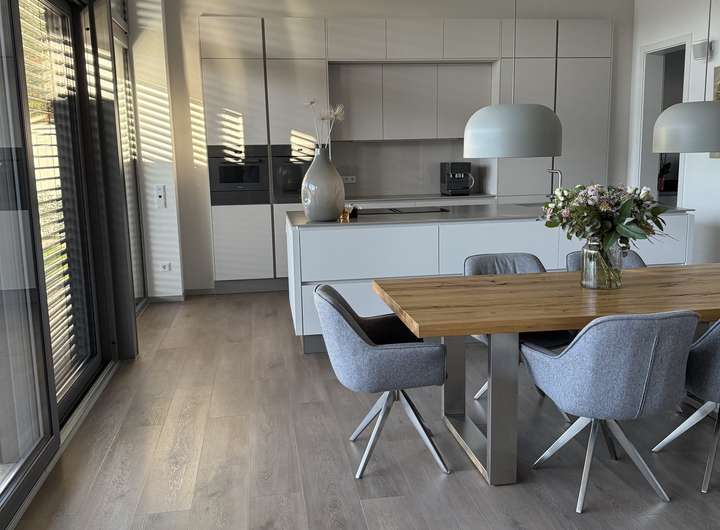 Der Lichtdurchflutete Wohn- und Essbereich mit bodentiefen Fenstern verbindet sich harmonisch mit der offenen, hochwertig ausgestatteten Küche.