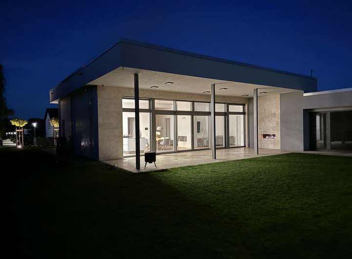 Auf rund 191qm Wohnfläche, Nutzfläche (38qm ) und 923qm großem Grundstück entfaltet sich ein offenes Raumkonzept mit fließenden Übergängen, klaren Linien und einer Atmosphäre von Licht und Modernität, die durch eine Deckenhöhe von 3,50m im Wohn-und Essbereich eindrucksvoll untermalt wird.