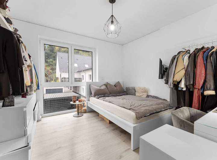 Dieses neuwertige Zweifamilienhaus erstreckt sich über zwei Etagen. Die untere Wohnung verfügt über 54 m² und die obere Wohnung über 101 m², ideal für unterschiedliche Wohnbedürfnisse.
