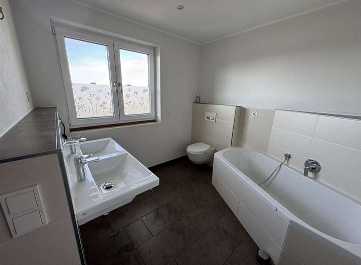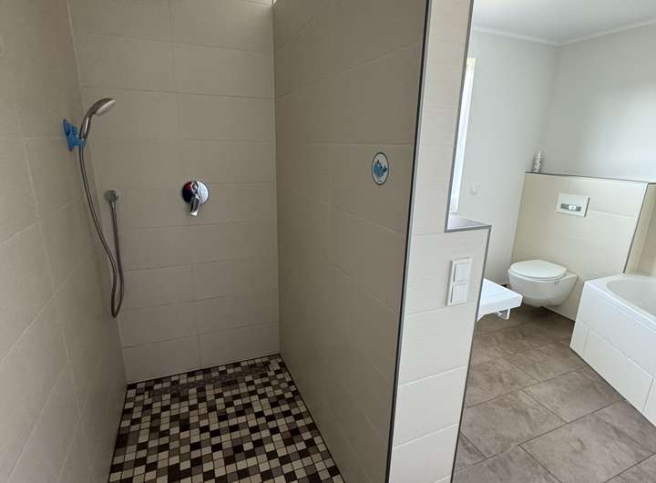 zum Balkon sowie das Bad mit ebenerdiger Dusche, Badewanne