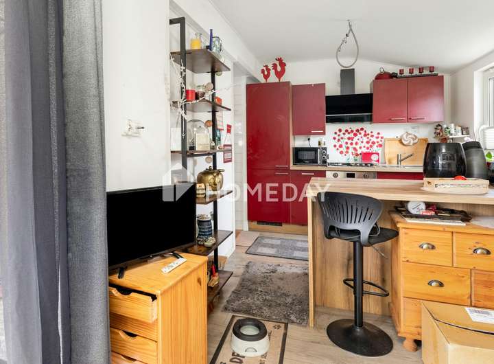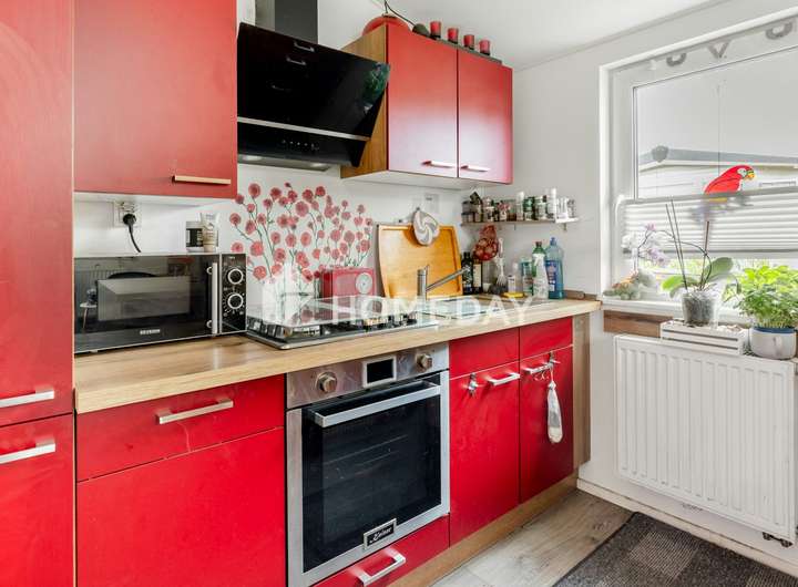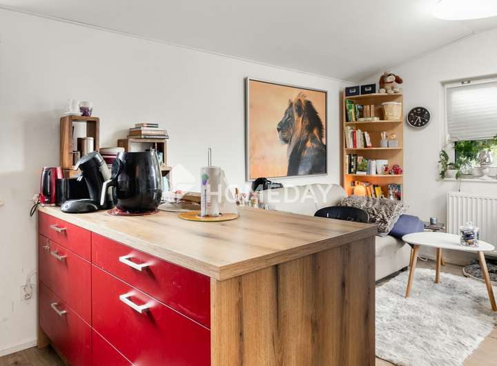 Der Bungalow umfasst 2,5 Zimmer. Mittelpunkt ist der helle Wohnbereich mit großen Fenstern und offener, moderner Küche. Rote Küchenfronten und ein integrierter Frühstückstresen setzen Akzente, die Küche ist funktional ausgestattet und bietet viel Stauraum.
