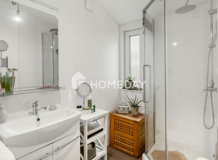 Das Schlafzimmer bietet Platz für ein Doppelbett, ein Abstellraum sowie ein kleiner Flur schaffen zusätzlichen Stauraum. Das Tageslichtbad überzeugt mit großzügiger Dusche und breitem Waschbecken.