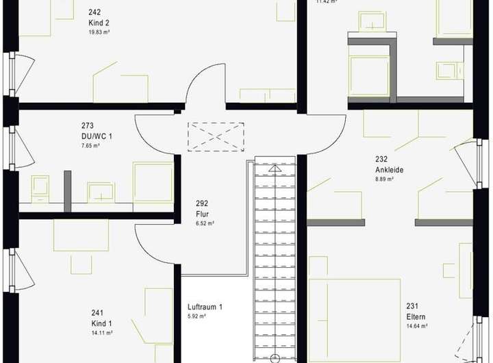Das Obergeschoss bietet Platz für eine private Wohlfühloase 🛁 mit zwei Bädern, einem Elternschlafzimmer mit begehbarer Ankleide 💕 sowie zwei Kinderzimmern. Der Luftraum mit Galerie sorgt für Offenheit und unterstreicht das elegante Raumgefühl.