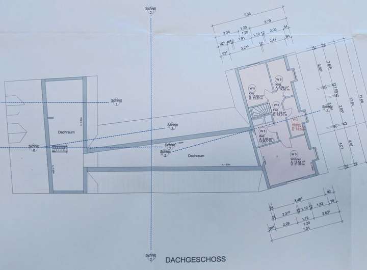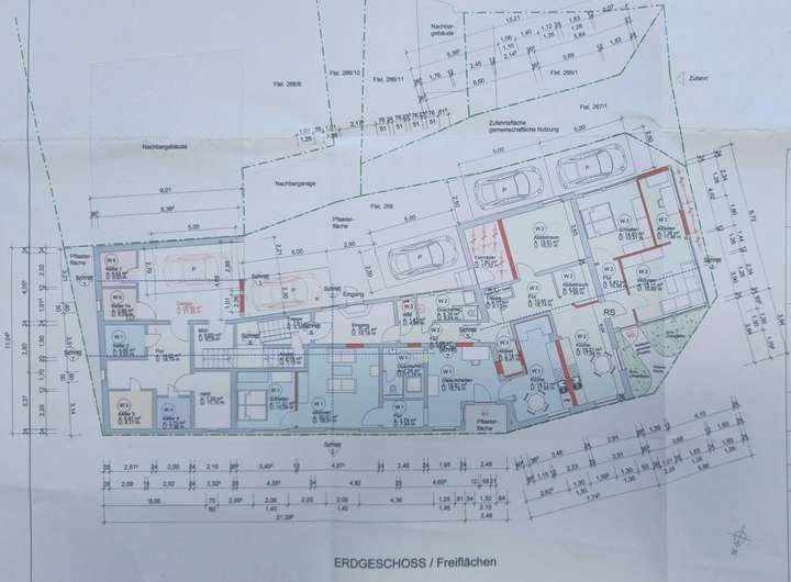 Die Wohnfläche beträgt 441 qm und ist aufgeteilt in Wohneinheiten zu 76,69 qm, 106,5 qm, 71,28 qm, 55,0 qm und 74,2 + 57,5 qm. Die Nutzflächen (Keller- und Abstellflöchen) betragen 96,9 qm. Das Obejekt hat eine Garage (26 qm) und vier Pkw-Stellplätze auf dem 507 qm großen Grundstück.
