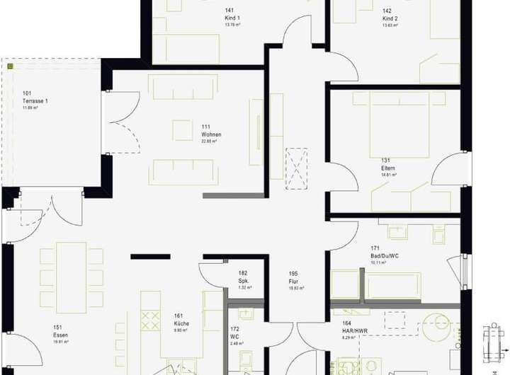 Auf rund 147 m² Wohnfläche bietet der Bungalow Wohlfühlwohnen auf einer Ebene. Das dreiseitig belichtete Esszimmer 🍽️ mit offener Küche sorgt für ein helles, einladendes Ambiente, während der Wohnbereich durch seine klare Struktur zum Mittelpunkt des Hauses wird.