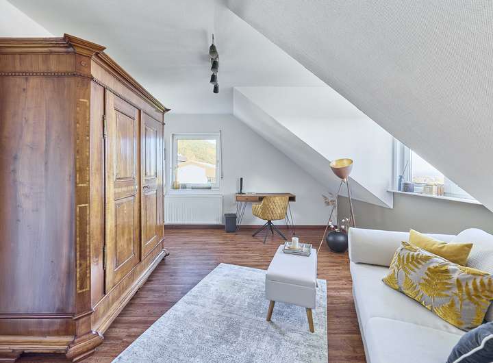 Im Obergeschoss erwarten Sie vier vielseitig nutzbare Räume sowie ein Tageslichtbad. Diese eröffnen zahlreiche Gestaltungsmöglichkeiten und eignen sich ideal als Schlaf-, Kinder- oder Arbeitszimmer.