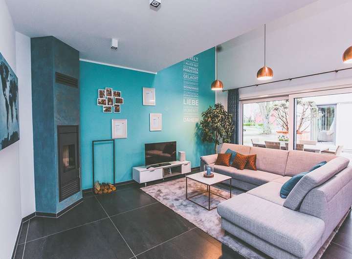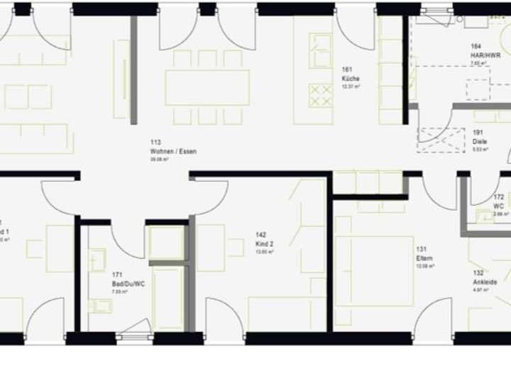 Das Satteldach mit klarer Linienführung und die bodentiefen Fensterflächen 🪟 verleihen dem Haus ein modernes, offenes Erscheinungsbild und lassen den Innenraum in hellem Tageslicht erstrahlen. Der großzügige Wohn- und Essbereich 🍽️ mit direkter Gartenanbindung 🌞 bildet das Herzstück des Hauses - perfekt zum Entspannen, Genießen und Zusammensein.