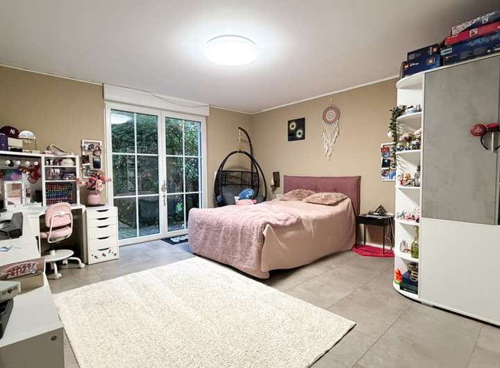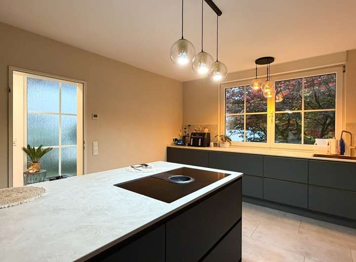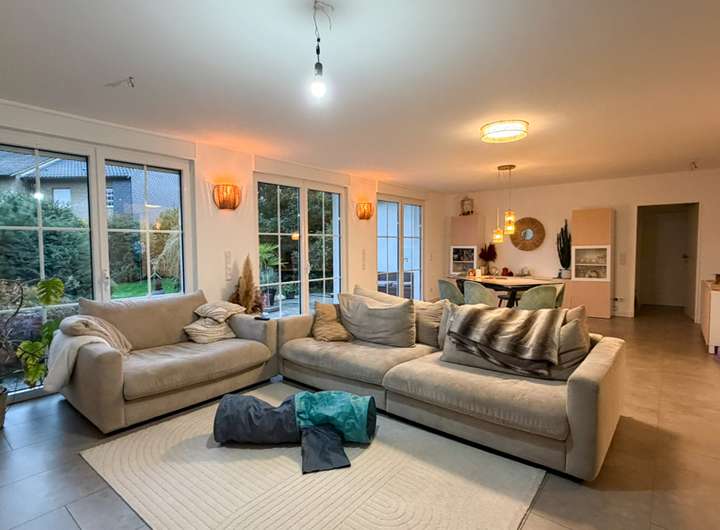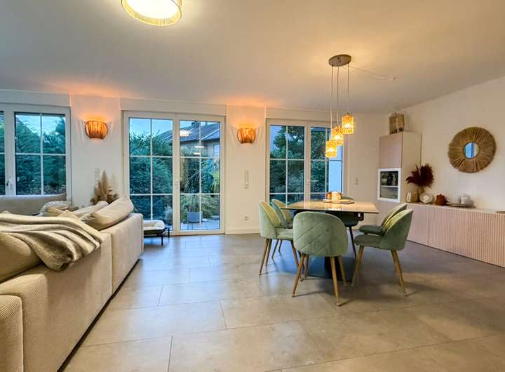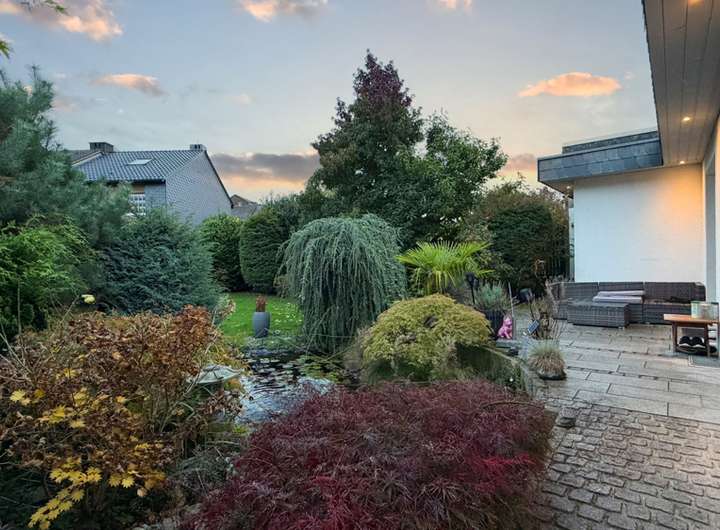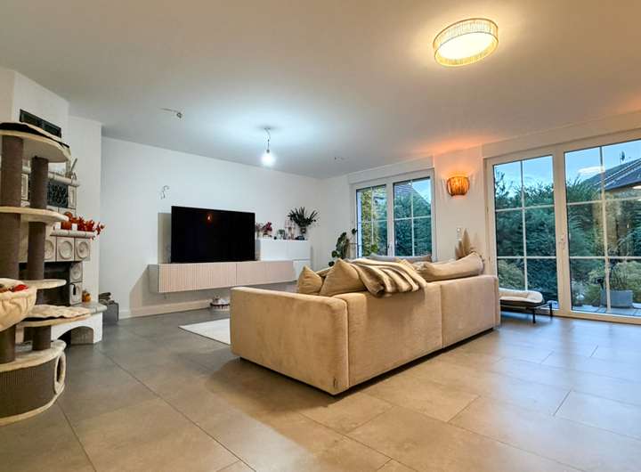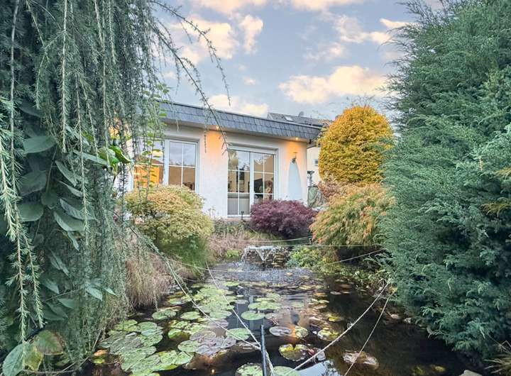 Der Bungalow überzeugt mit einer Wohnfläche von ca. 132 m², einer Nutzfläche von ca. 226 m² und einer Fußbodenheizung. Das großzügige Wohn- und Esszimmer mit bodentiefen Fenstern, Kamin und direktem Zugang zum liebevoll angelegten Garten mit Teich (ca. 340 m²) bietet eine besondere Wohlfühlatmosphäre. Die hochwertige Einbauküche lässt keine Wünsche offen und ist direkt mit der Garage verbunden – zusätzlich steht ein weiterer Stellplatz vor der Garage zur Verfügung. Das stilvolle Badezimmer mit moderner Spanndecke und ein separates Gäste-WC runden das Raumangebot ab. Im Kellergeschoss befinden sich ein Hauswirtschaftsraum, ein Souterrainraum sowie ein weiterer Raum, der sich ideal für den Ausbau einer Sauna oder eines Fitnessbereichs eignet. Die Ölheizung stammt aus dem Jahr 2000 und befindet sich in gepflegtem Zustand.